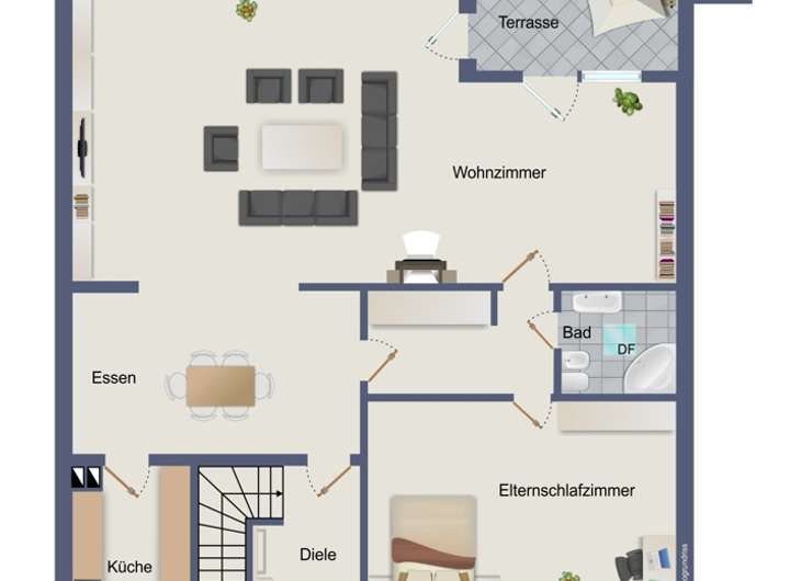 Die Materialauswahl mit Fliesen- und Teppichböden verleiht dem Haus eine wohnliche Mischung aus Pflegeleichtigkeit und Behaglichkeit. Das repräsentative Marmortreppenhaus führt hinunter in den Souterrainbereich und unterstreicht den gehobenen Eindruck des Hauses.