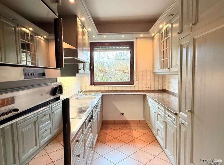 Die Küche, ausgestattet mit einer Einbauküche, ist funktional und zugleich freundlich gestaltet. Von hier aus gelangt man direkt ins Esszimmer und weiter in den Wohnbereich.