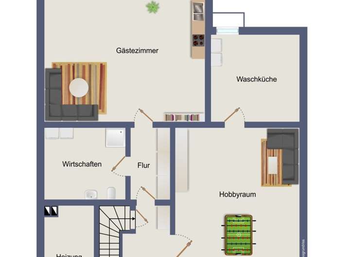 Dank vorhandener Küchenanschlüsse besteht die Möglichkeit, hier eine eigenständige Einheit zu schaffen. Das Duschbad mit WC erweitert die Nutzbarkeit zusätzlich und macht den Bereich vollkommen autark. Besonders hervorzuheben sind die Anschlüsse für eine Sauna, die es erlauben, eine private Wellnessoase einzurichten. Ergänzt wird dieser Bereich durch eine geräumige Waschküche, die praktischen Stauraum und Funktionalität bietet.