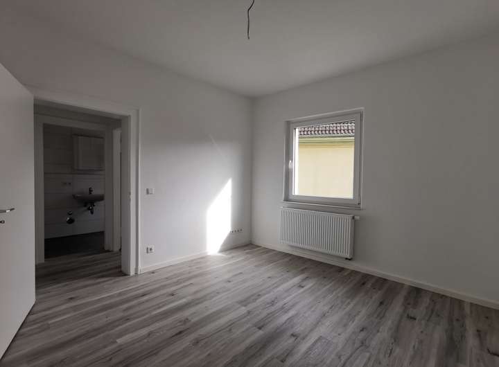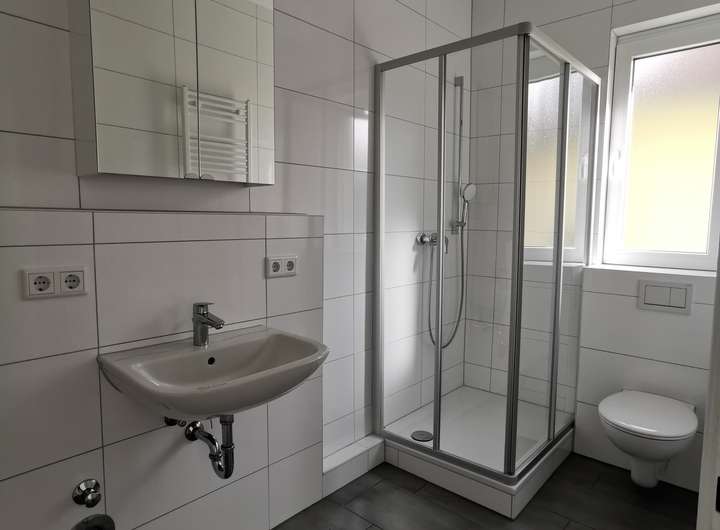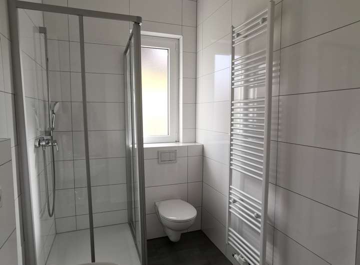 Die Wohnung verfügt über eine moderne Gemeinschaftsküche mit Einbauküche (E-Herd, Ceranfeld, großer Kühlschrank, Spülmaschine) und einem tageslichtdurchfluteten Gemeinschaftsbad, sowie einem separaten WC.