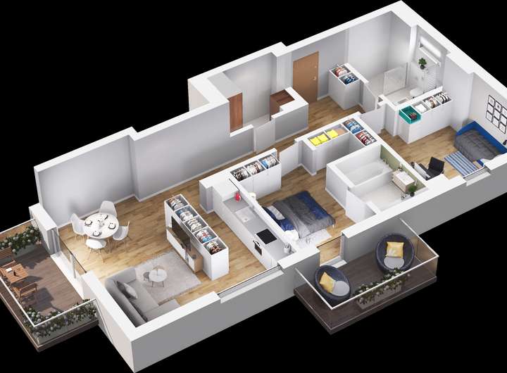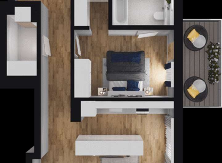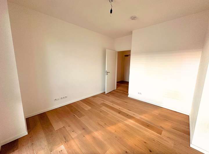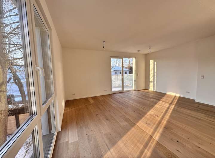 Die hier angebotene Wohnung erstreckt sich über 88 m² und umfasst drei Zimmer. Das nach Süden ausgerichtete Wohnzimmer mit offener Küche öffnet sich zum Balkon mit über ca. 8 m² Fläche hin. Eines der übrigen zwei Zimmer ist ein Schlafzimmer mit Bad-en-Suite mit einer Badewanne, einem Ankleideraum mit Schiebetür und einem nach Westen ausgerichteten Balkon, ebenso mit einer Größe von ca. 8 m². Das dritte Zimmer kann als zusätzliches Schlafzimmer oder Arbeitszimmer genutzt werden. Die Wohnung verfügt über ein weiteres Tageslichtbad mit bodentiefer Dusche, sowie einer Abstellkammer mit Waschmaschinenanschluss. Die Fenster sind mit elektrischen Außenraffstores ausgestattet. Zwei Außenstellplätze sind bereits im Kaufpreis enthalten.