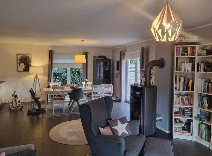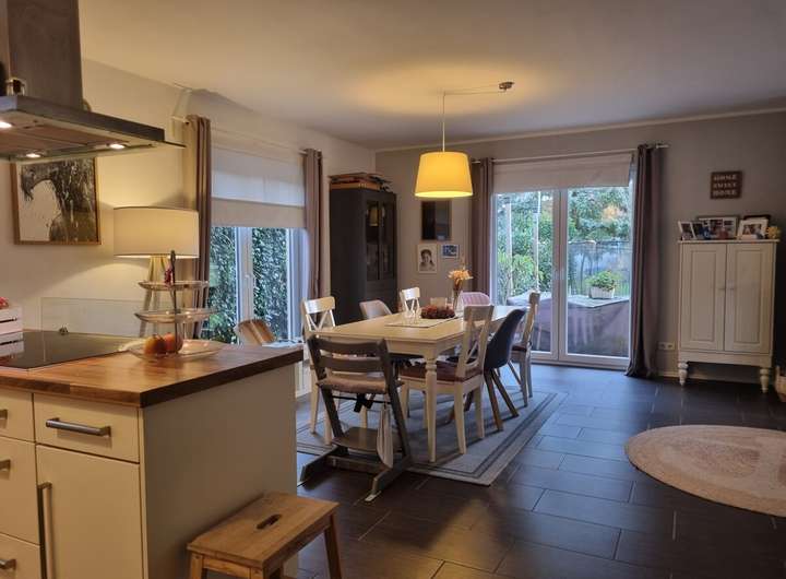 Das Erdgeschoss: Großzügiger Wohn- und Essbereich mit offener Küche, direkter Zugang zum Garten, moderne, pflegeleichte Bodenbeläge, freundliches Raumgefühl durch bodentiefe Fenster.