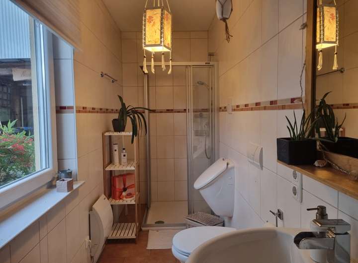 Das Bad ist modern gestaltet und verfügt über funktionale Armaturen.