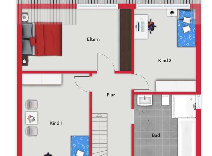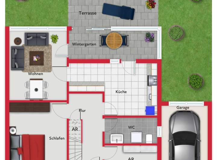 Dach: Satteldach, eingedeckt mit Betondachsteinen
