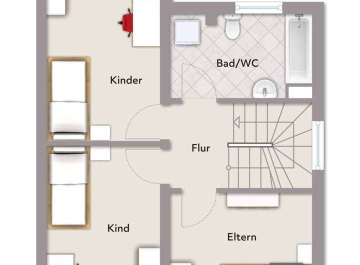 Im Obergeschoss stehen drei Schlafzimmer zur Verfügung, die sich flexibel als Kinderzimmer, Rückzugsort oder Homeoffice nutzen lassen. Eines der Zimmer bietet zusätzlich Zugang zu einer überdachten Loggia. Ein funktional geschnittenes Badezimmer rundet diese Etage ab.