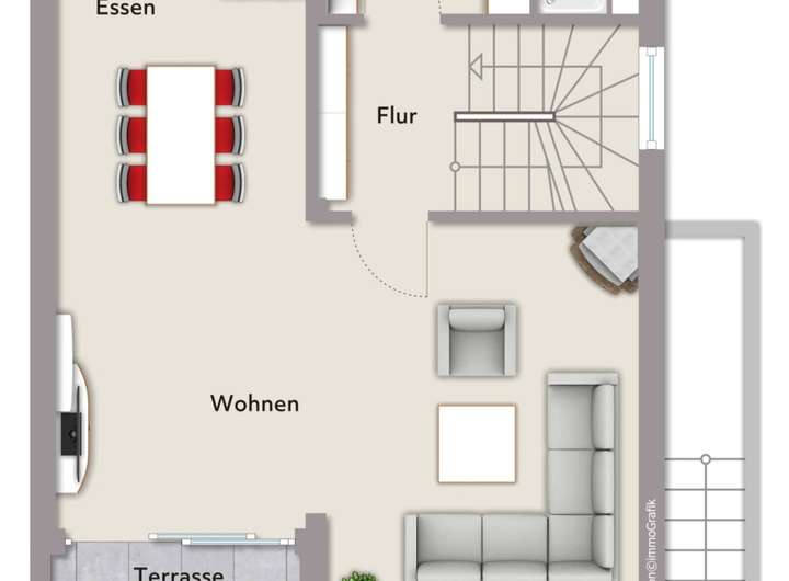 Im Erdgeschoss öffnet sich das Haus mit einem offenen Wohn- und Essbereich, der dank großer Fensterflächen hell und einladend wirkt. Der offene Kamin setzt einen atmosphärischen Akzent und macht den Raum besonders an Winterabenden zum Mittelpunkt des Hauses. Von hier aus gelangt man direkt auf die nicht einsehbare Südterrasse – ein geschützter Außenraum, ideal für entspannte Stunden im Freien. Die Küche liegt angrenzend und bietet kurze Wege zum Essplatz. Ein Gäste-Bad mit Dusche vervollständigt das Erdgeschoss.