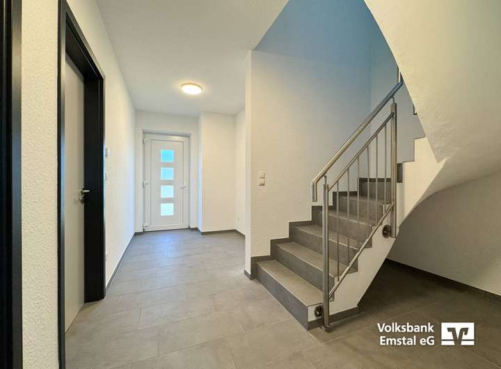 Edle Elemente aus einem ehemaligen Bankgebäude, wie stilvolle Türen und Sandstein-Fensterbänke, verleihen dem Haus einen besonderen Charakter. Große Fenster, Raffstores und ein offener Grundriss schaffen ein helles, einladendes Wohnambiente mit direktem Zugang zum Garten.