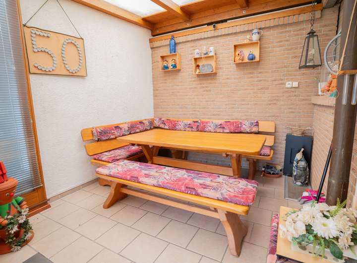 Das Haupthaus umfasst rund 177 m². Im Obergeschoss befinden sich drei komfortable Schlafzimmer, ein helles Tageslichtbad sowie ein Balkon mit Blick ins Grüne. Das Erdgeschoss bietet ein großzügiges Wohn- und Esszimmer, eine Küche, einen Hobbyraum, einen weiteren Balkon und eine geschützte Loggia, die sich auch an weniger warmen Tagen hervorragend nutzen lässt. Das Haus ist voll unterkellert und eröffnet im Untergeschoss zusätzliche Möglichkeiten für Stauraum, Hobby oder individuelle Nutzungsideen.