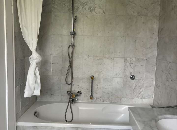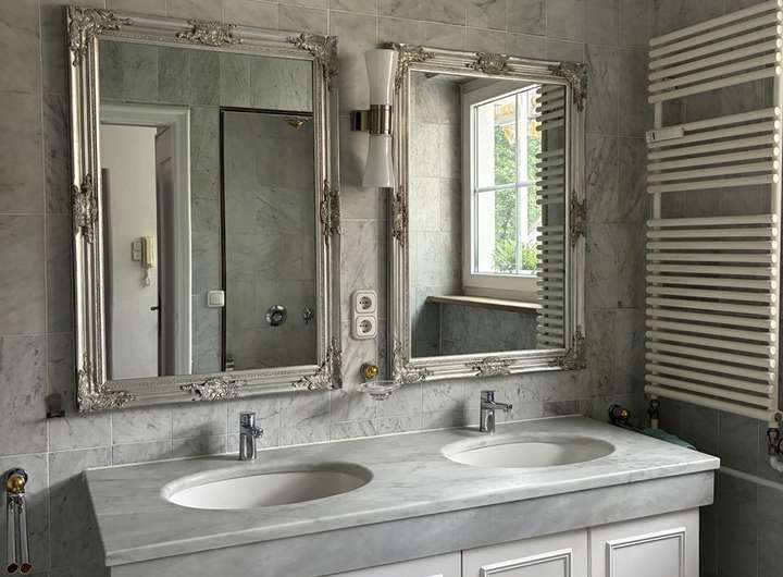 - Tageslicht-Badezimmer, raumhoch gefliest mit edlen Marmorfliesen, Doppelwaschbecken, Badewanne, Handtuchheizung