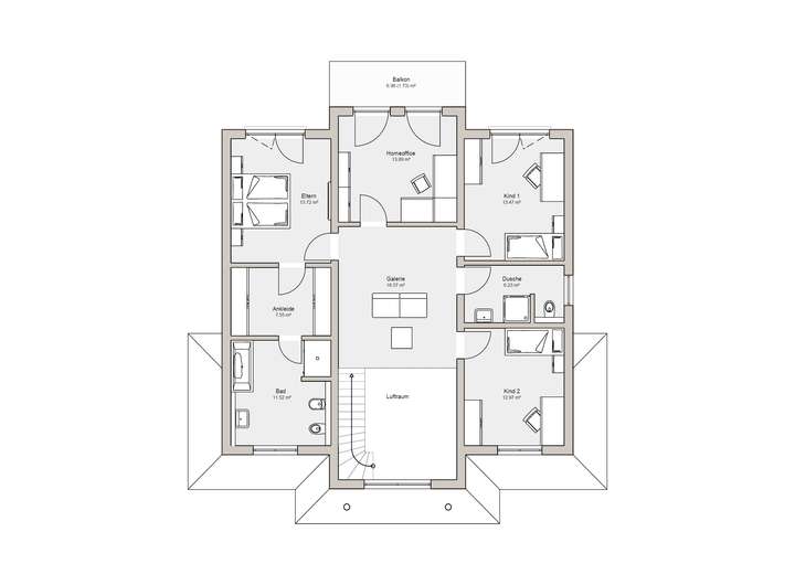 Im Obergeschoss gelangt man von der Galerie in zwei Kinderzimmer mit separatem Bad, in ein Home-Office mit einem direkt angrenzenden Balkon und in das Haupt-Schlafzimmer. An dieses Schlafzimmer grenzt direkt ein Ankleideraum und das eigene Wellness-Badezimmer, dass mit viel Fläche zum Entspannen einlädt.