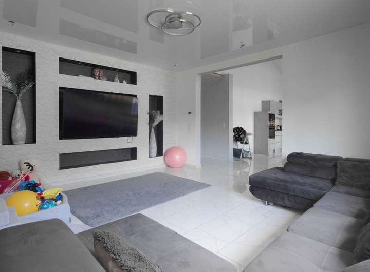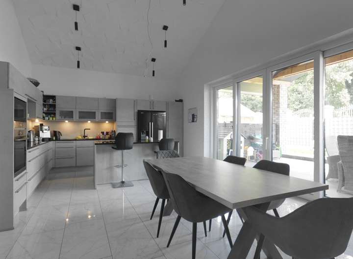 Die ca. 171 m² Wohnfläche verteilen sich auf einen ca. 60 m² großen Koch-, Ess- und Wohnbereich mit hochwertiger Einbauküche und Zugang zur überdachten Terrasse. Ein Elternschlafzimmer schließt sich dem großen Wohnbereich an. Ein abgetrennter Ankleidebereich sorgt für eine schöne Ordnung.