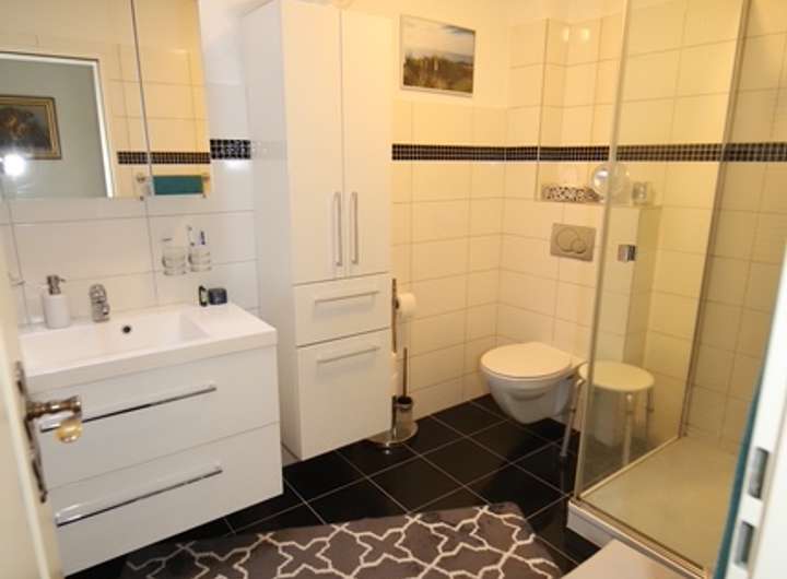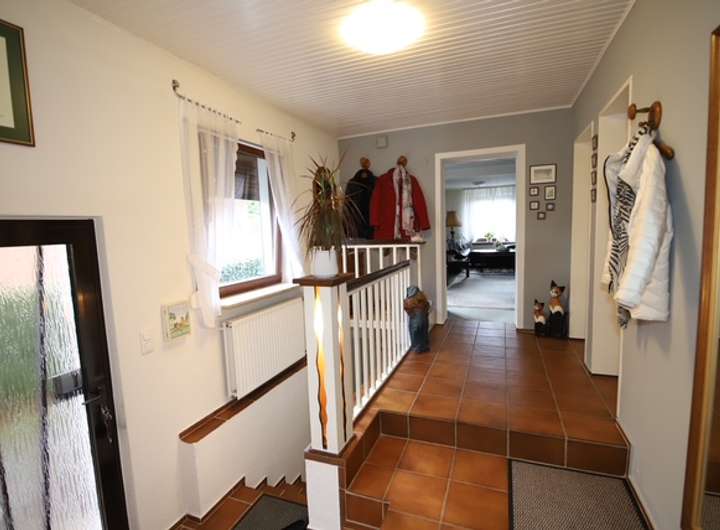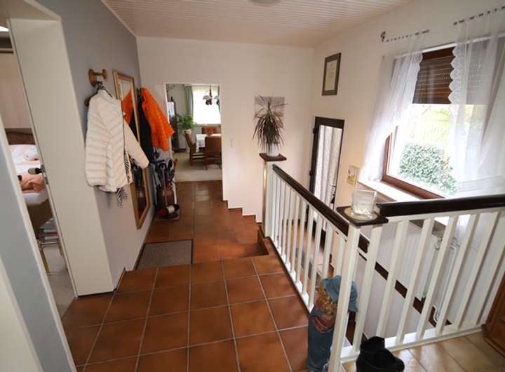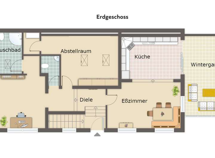 Die Wohnfläche besteht im Erdgeschoß aus einem Wohnbereich (teilbar in 2 Zimmer), einem Eßzimmer, einer Küche einem Duschbad, einem Gäste-WC einer Diele, einem Abstellraum, einem Wintergarten (zu 50%) sowie einer großen Terrasse (zu 25%).