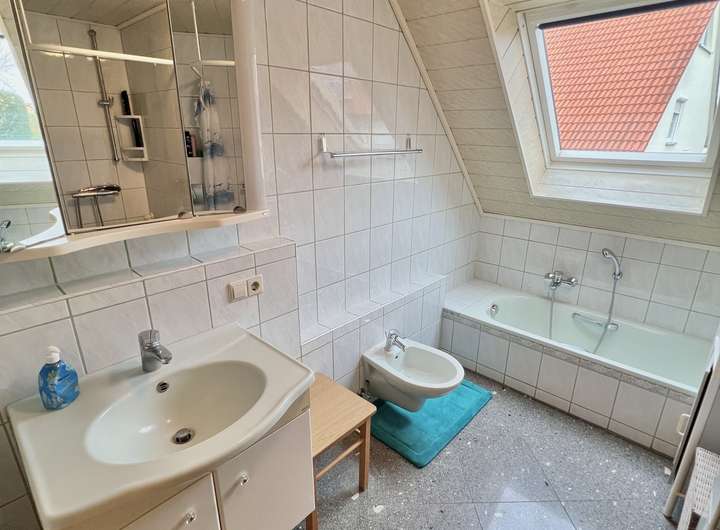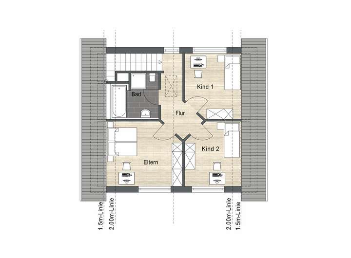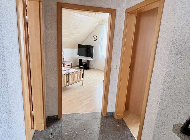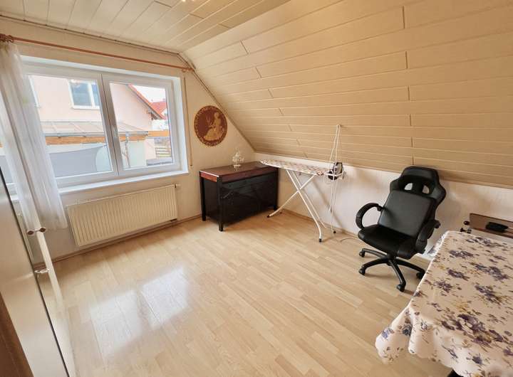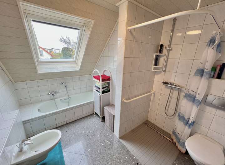 Über die Treppe im Wohnbereich erreichen Sie das Dachgeschoss in dem sich ein Elternschlafzimmer sowie zwei weitere gut geschnittene Zimmer, die sich flexibel als Kinder- oder Arbeitszimmer nutzen lassen, befinden. Ein Tageslichtbad mit Badewanne, begehbarer Dusche und einem WC komplettiert das Stockwerk und sorgt für hohen Wohnkomfort.