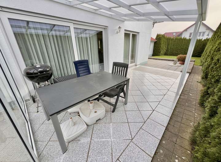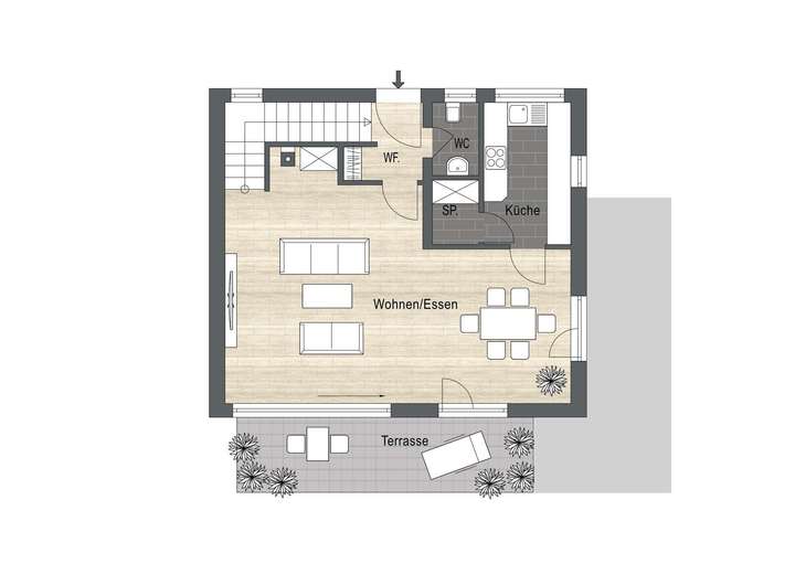 Beim Betreten der Immobilie empfängt Sie zunächst ein Eingangsbereich (inkl. praktischer Garderobe), bevor sich der großzügige Wohn- und Essbereich öffnet. Große Fensterfronten sorgen dort für eine helle, freundliche Atmosphäre mit Zugang auf die teilweise überdachte Terrasse mit Garten. Die angrenzende Küche ist funktional gestaltet und verfügt über eine zusätzliche (separate) Abstellmöglichkeit. Ein Gäste-WC ergänzt das Raumangebot auf dieser Ebene.