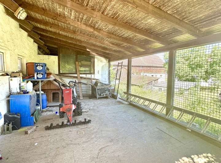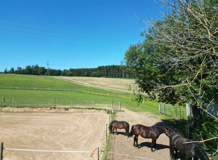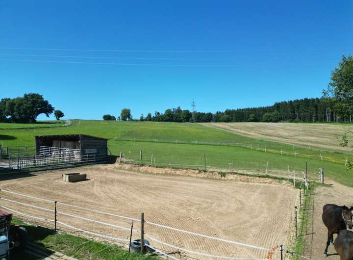 Auf dem rund 3,17 ha großen Grundstück können Stallungen für bis zu sieben Pferdeboxen eingerichtet werden, ein großzügiger Sandreitplatz, Koppeln mit Wolfszaun und Unterstand sowie weitläufige Wiesen für artgerechte Bewegung. Eine Maschinenhalle, ein großes Heulager und eine geräumige Unterstellhalle für Tiere oder Geräte sorgen für optimale Arbeitsabläufe. Für Kleintiere stehen ein Hühnerstall und ein Ziegenstall mit Auslauf bereit.