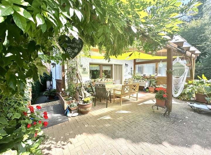 Der liebevoll gestaltete Garten ist vom Landwirtschaftlichen Bereich getrennt und lädt mit einem romantischen Teich, Goldfischen und einer gemütlichen Gartenhütte zum Entspannen ein. Für Fahrzeuge stehen eine Doppelgarage und mehrere Stellplätze zur Verfügung – auch für Pferdeanhänger oder größere Fahrzeuge geeignet.