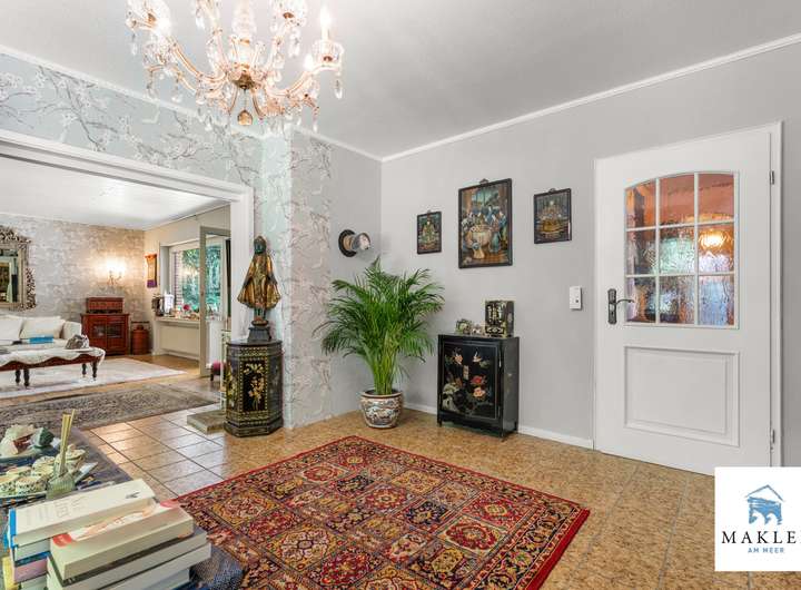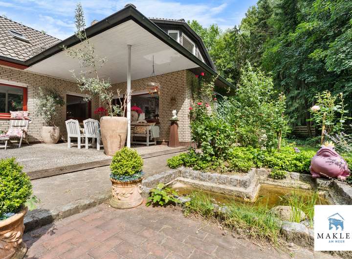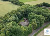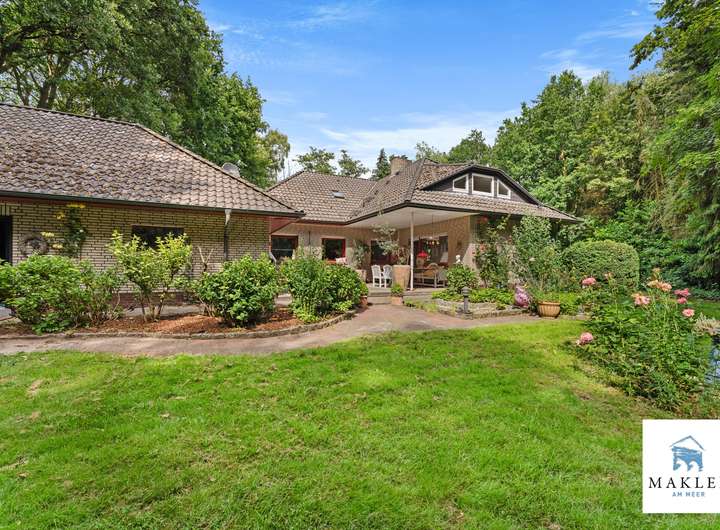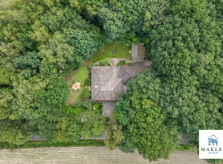 Das ca. 8.000 m² große Grundstück bietet nahezu Alleinlage. Nur ein direkter Nachbar, sonst umgibt Sie nichts als Grün, gewachsene Bäume und Vogelgezwitscher. Das Haus selbst liegt zurückversetzt, umarmt von Sträuchern und Rosen, mit einem verwunschenen Garten, der sich in jede Richtung ausdehnt. Der elegante weiße Klinkerbau mit seinem markanten Winkelwalmdach und der charmanten Fledermausgaube wirkt imposant, aber nicht aufdringlich – vielmehr einladend.