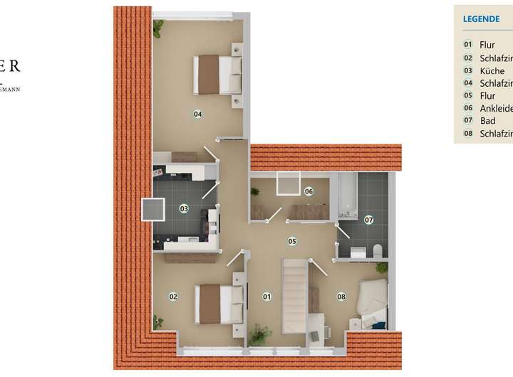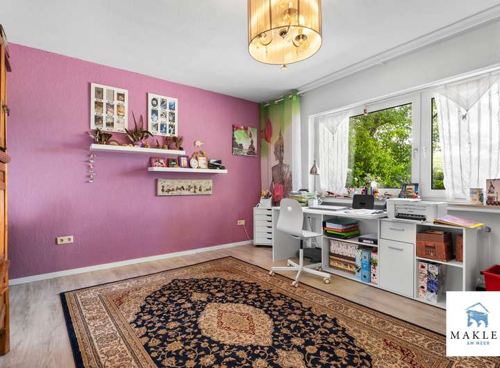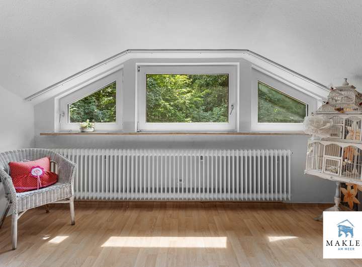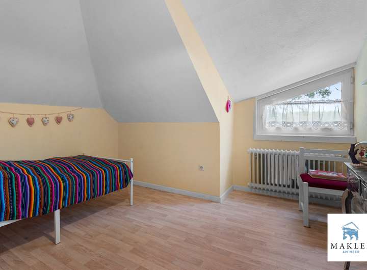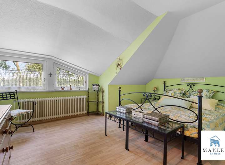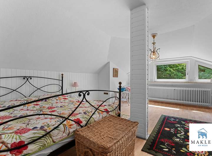 Im Dachgeschoss befinden sich neben dem Bad mit Wanne, Dusche und Velux-Fenster auch zwei große Schlafzimmer, ein kleines Büro, ein Gästezimmer sowie ein Raum mit Küchenanschluss – ideal für eine Einliegerwohnung oder ein Studio.