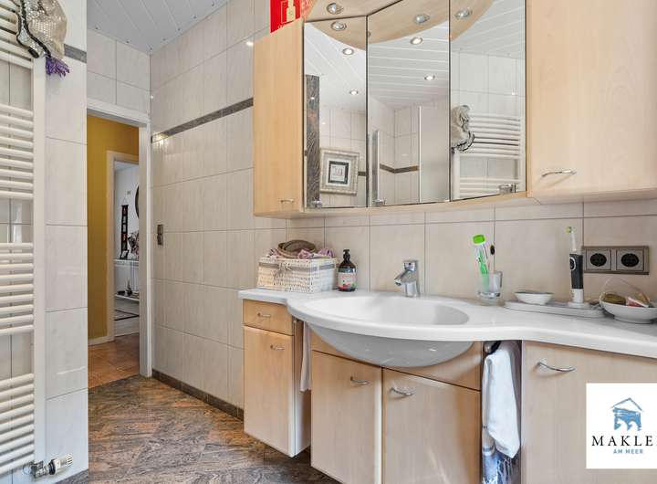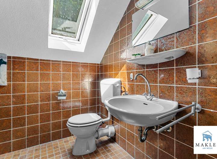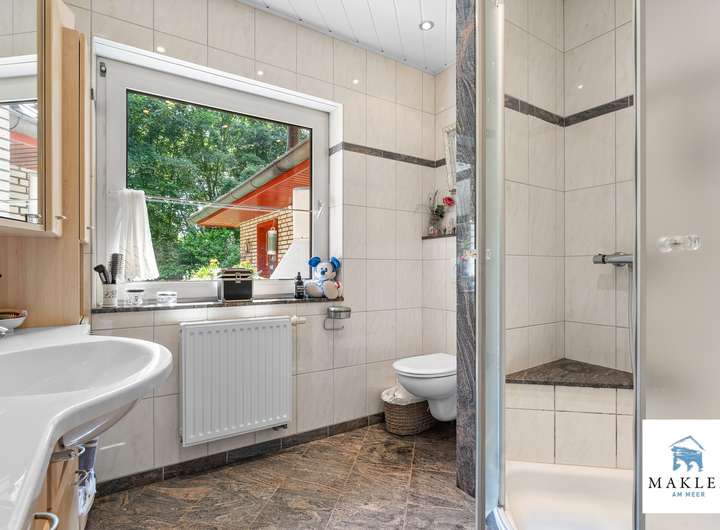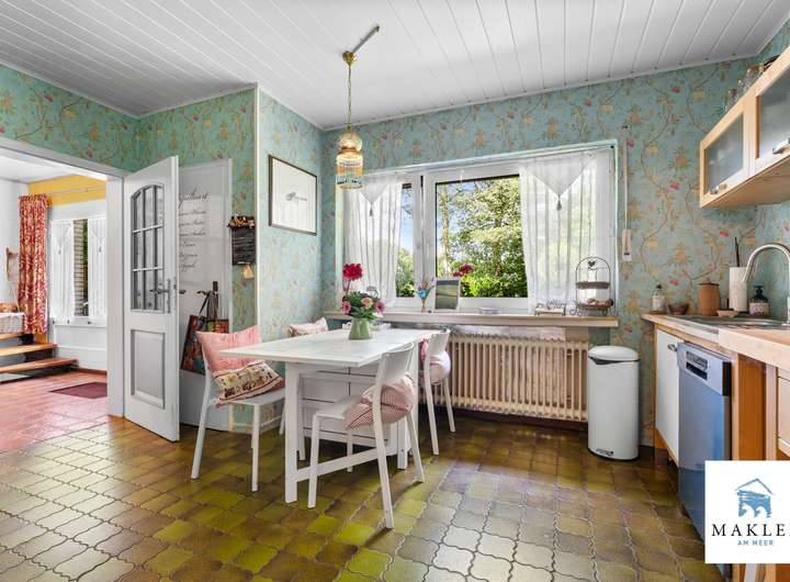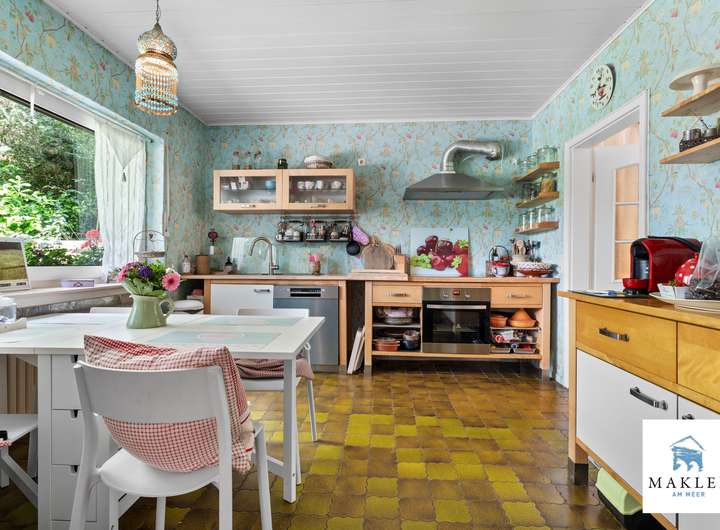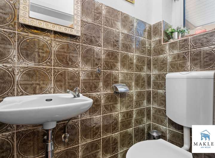 Die Küche ist individuell gestaltet, mit offenen Elementen und nostalgischen Details. Das Badezimmer im Erdgeschoss wurde modernisiert – hell gefliest, mit bodentiefer Dusche und Tageslicht. Zusätzlich gibt es ein separates Gäste-WC.
