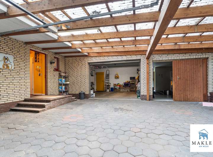 Zum Haus gehören außerdem ein überdachtes Carport für zwei Fahrzeuge, eine separate Garage sowie ein hochwertig gebautes Blockhaus mit Stromanschluss und Thekenanlage – perfekt für gesellige Runden, Hobbys oder kreative Nutzung.