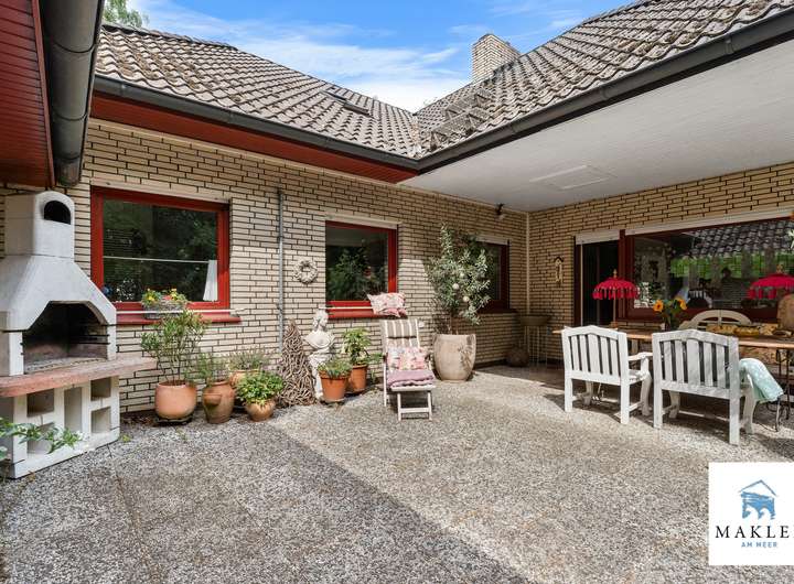Die Grundrissgestaltung ist durchdacht und großzügig: Eine offene, helle Diele mit geschwungener Treppe empfängt Besucher. Im Erdgeschoss befinden sich ein Esszimmer, ein Wohnzimmer mit Zugang zur geschützten Terrasse, eine geräumige Küche, ein modernes Tageslichtbad sowie mehrere flexibel nutzbare Zimmer – für Gäste, Büro oder Hobby. Ein Gäste-WC ergänzt das Raumangebot. Die überdachte Terrasse bildet das Zentrum des Außenbereichs: ein geschützter Innenhof mit mediterranem Flair, liebevoll dekoriert und voller Leben.