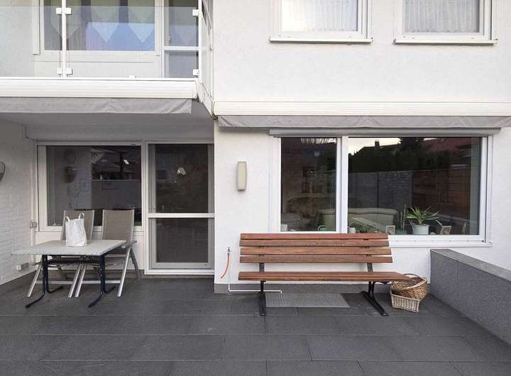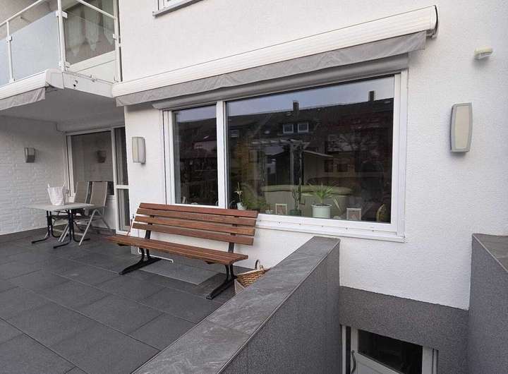 Im Erdgeschoss erwartet Sie ein freundlicher Eingangsbereich, der in die moderne, funktional gestaltete Küche mit hochwertiger Einbauküche führt – ideal für alle, die gerne kochen und Wert auf Komfort legen. Der großzügige Wohn- und Essbereich bildet das Herzstück des Hauses. Große Fensterflächen sorgen hier für ein lichtdurchflutetes Raumgefühl und schaffen eine angenehme Wohnatmosphäre. Von hier aus gelangen Sie direkt auf die sonnige Terrasse, die mit zeitgemäßen Platten ausgelegt ist und zum Entspannen oder geselligen Beisammensein einlädt. Die Fensterfronten zur Terrasse sind mit elektrischen Markisen ausgestattet und bieten optimalen Schutz vor Sonneneinstrahlung.