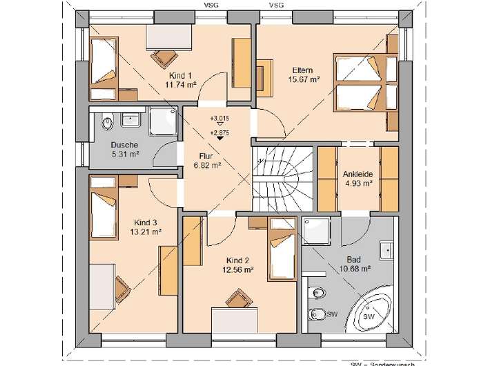 Im Obergeschoss sind die Individualräume angeordnet: Drei Kinderzimmer mit separatem Duschbad und das Domizil für die Eltern mit luxuriöser Ankleide als Zugang zum separatem Eltern-Bad bieten maximalen Wohnkomfort.