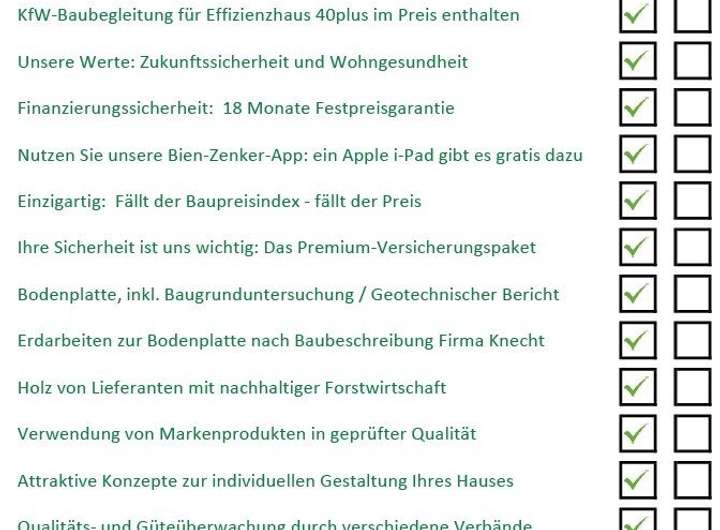 Ihr neues Bien-Zenker-Haus ist ein Effizienzhaus 55. Mit der integrierten Lüftung und Kühlung haben Sie auch im Hochsommer immer ein angenehmes Raumklima. Es wird in der Ausstattungsstufe "Zur Ausstattung fertig" hergestellt. Weniger Eigenleistung - kein Problem. Mehr Eigenleistungen - auch kein Problem.
