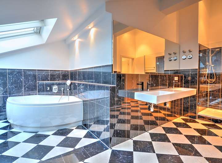 Auf der rechten Seite erschließt sich ein Raum, der sich ideal als Kinderzimmer oder Ankleide eignet. Direkt daneben liegt das beeindruckend große Badezimmer, das mit einer hochwertigen Ausstattung begeistert: Eine moderne Whirlpool-Badewanne, eine großzügige Dusche, ein neues elegantes Waschbecken sowie hochwertige Armaturen schaffen ein exklusives Wellness-Ambiente. Mehrere Dachflächenfenster sorgen für viel Tageslicht und eine freundliche, offene Atmosphäre.