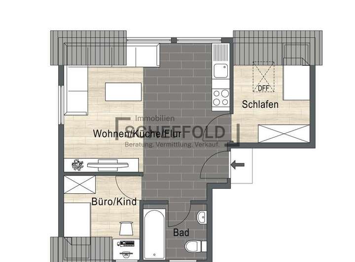 Neben einem ruhig gelegenen Schlafzimmer und einem mit viel Licht durchfluteten Wohn- und Essbereich samt Küche steht Ihnen hier ein weiteres helles Zimmer als separates Wohnzimmer, Büro oder Kinderzimmer sowie ein kompaktes Badezimmer zur Verfügung. Das Tageslicht-Badezimmer ist voll ausgestattet mit einer Badewanne, Duschabtrennung, einer Toilette sowie einem Waschbecken.