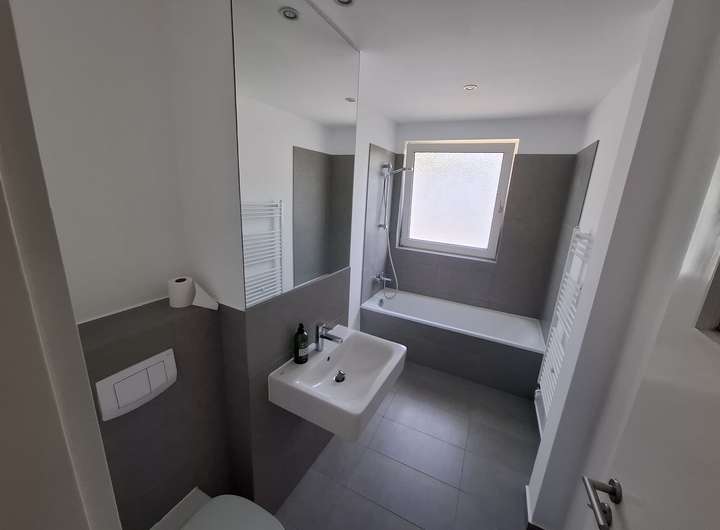 Das Tageslichtbad ist grau gefliest und verfügt über eine Badewanne, einen Handtuchheizkörper, ein Fenster sowie einen praktischen Waschmaschinenanschluss.