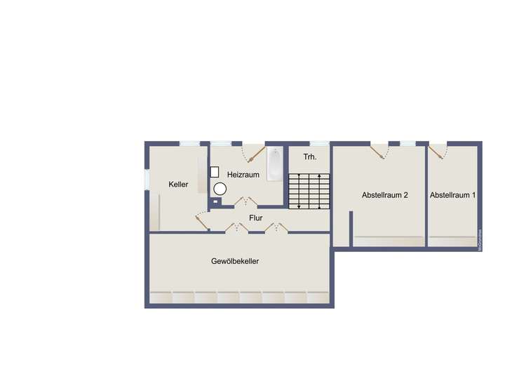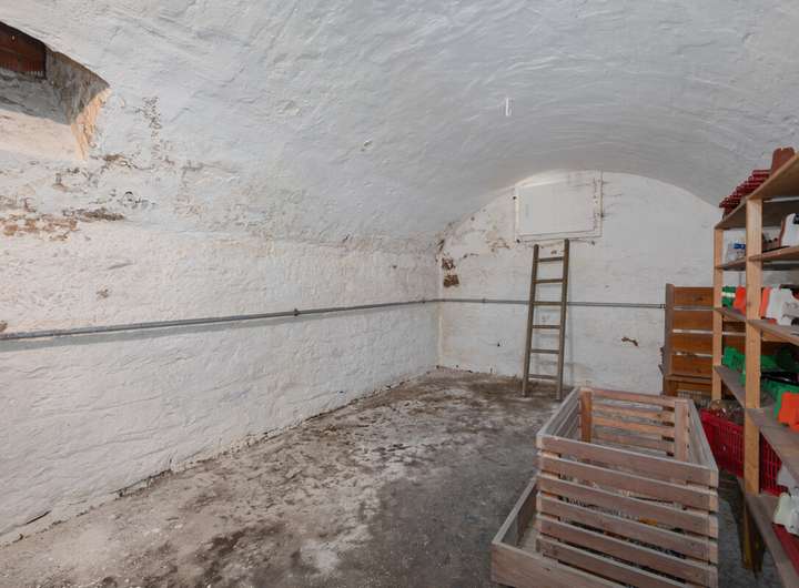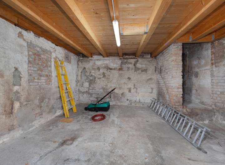 Im Untergeschoss steht ein großer Gewölbekeller, ein Abstellraum und der Heiz-/Waschraum mit Zugang zur Terrasse und zum Garten zur Verfügung.