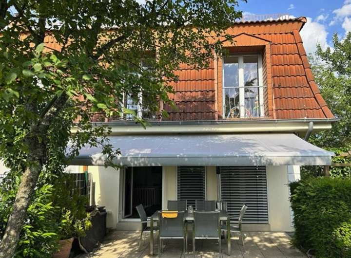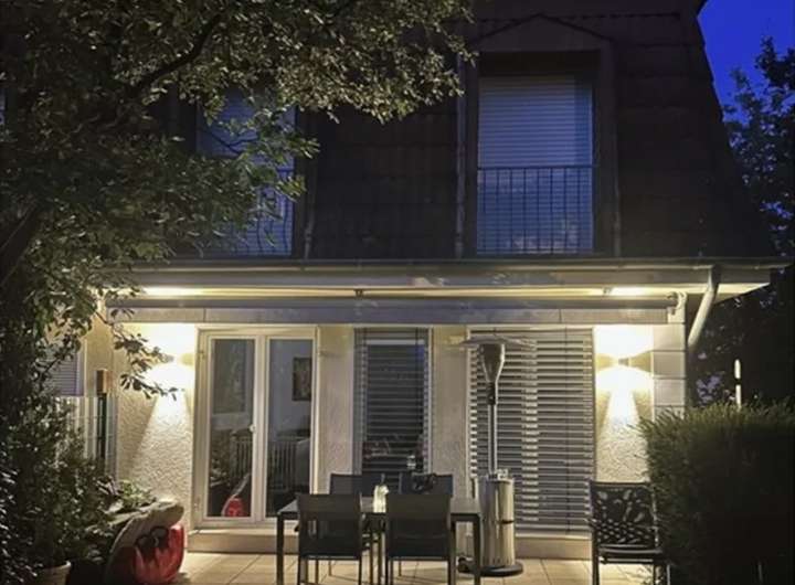 Vom Wohnbereich führt der Zugang auf die sonnige Westterrasse, die ideal zum Entspannen und für gemütliche Abendstunden einlädt. Raffstore-Anlagen an den Fenstern sorgen hier für eine moderne, flexible Beschattung. Ein Gäste-WC ist ebenfalls vorhanden.