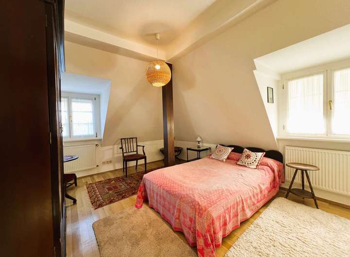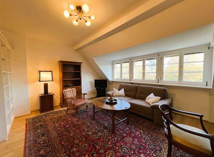Vermietet wird eine möblierte Dachgeschosswohnung mit ca. 65 m² Wohnfläche und zwei Zimmern. Die Altbauwohnung aus 1925 besticht durch einen guten Zuschnitt, der ein großzügiges Raumgefühl schafft, sowie durch die Verbindung von Wohnbereich und Küche über eine dekorative antike Glastür. Große Fensterflächen sorgen für eine freundliche, lichtdurchflutete Wohnatmosphäre.