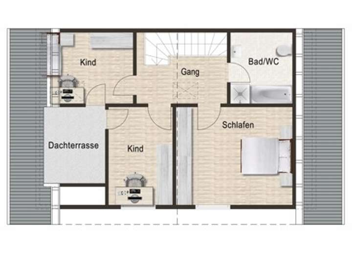 - Zwei Kinderzimmer, die zum Wohlfühlen einladen und jeweils einen Zugang zur Dachterrasse haben.