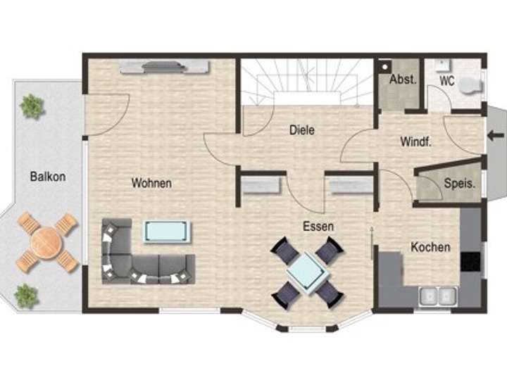 - Eine Diele mit Platz für eine Garderobe und Treppenaufgang in die obere Etage. So sind Sie bei Besuchen Ihrer Kinder in Ihrem Wohn-Essbereich nicht gestört, da der Eingangsbereich und der Treppenaufgang abgeschlossen sind.