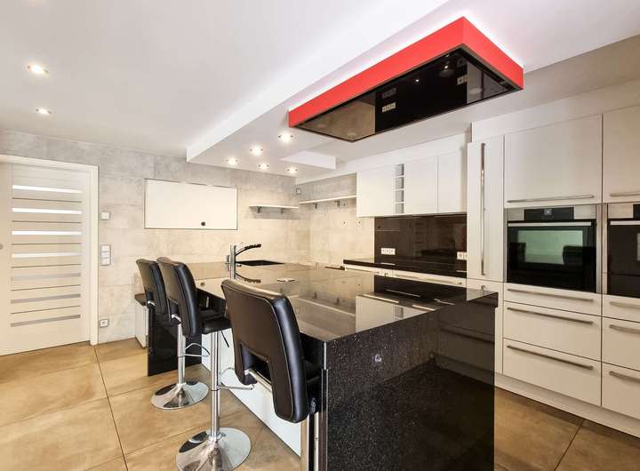 - Küche mit Einbauküche und Kochinsel mit leistungsstarker Deckendunstabzugshaube