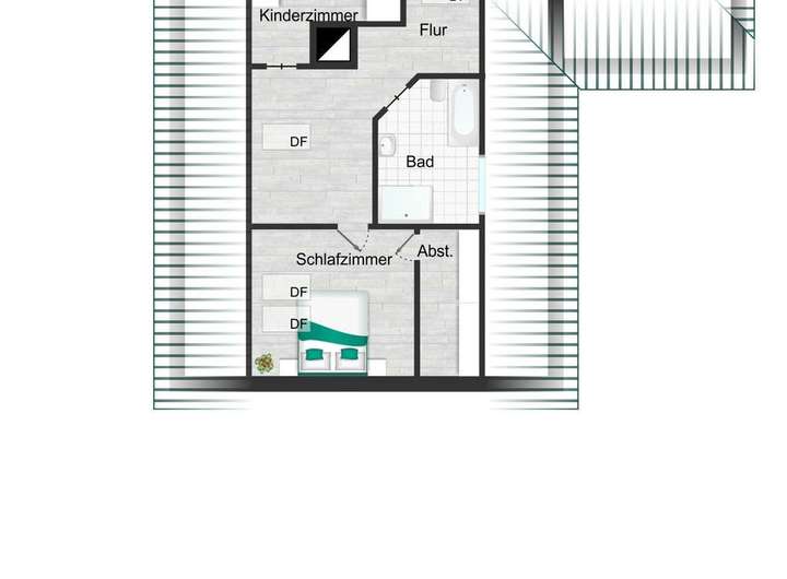 Im Dachgeschoss finden Sie zwei helle und gut geschnittene Räume, die vielseitig genutzt werden können. Das zweite Tageslichtbad ist mit einer ebenerdigen Dusche, einer Badewanne und einem formschönen Waschbecken mit Unterschrank ausgestattet. Es bietet eine perfekte Ergänzung für das Wohnkonzept der oberen Etage.