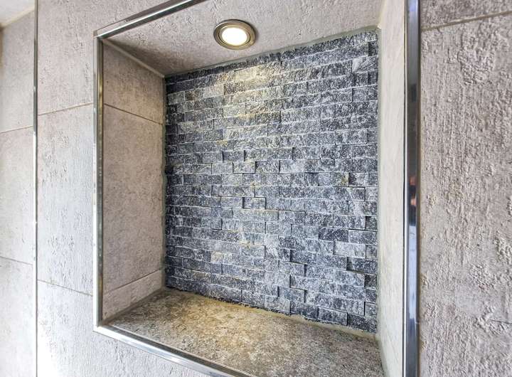 Ein modernes Tageslichtbad überzeugt mit einer ebenerdigen Regenfalldusche von GROHE Spa mit Licht- und Musikmodulen, einem Handtuchheizkörper, einem großen Wandspiegel sowie einem hochwertigen Waschbecken mit Unterschrank. Die exklusiven Wandfliesen und die Wohlfühlbeleuchtung schaffen eine angenehme Atmosphäre. Zudem sorgen Downlights und die Fußbodenheizung für zusätzlichen Komfort.