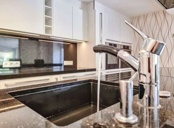 Die Küche ist mit einer modernen Einbauküche ausgestattet, die mit Einbaubackofen, Dampfgarer, Wärmeschublade und einer großen Kochinsel mit Deckendunstabzugshaube keine Wünsche offen lässt. In der Sitzecke mit einer polierten Granittischplatte lässt sich der Kochbereich gemütlich genießen.