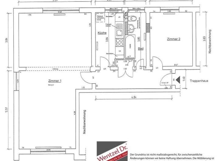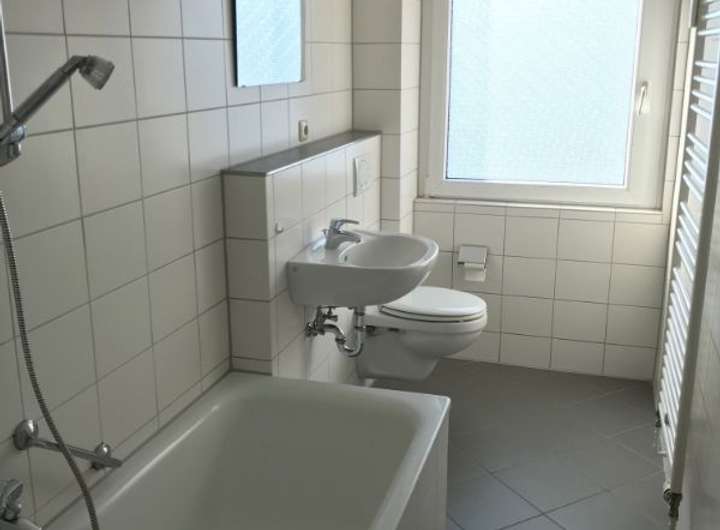 Die lichtdurchflutete Wohnung ist mit einer Küchenzeile ausgestattet, welche Platz für einen Kühlschrank, Oberschränke und eine Wasch- oder Geschirrspülmaschine lässt. Das Vollbad ist mit weißen Wand- und dunklen Bodenfliesen versehen und verfügt über ein Fenster.