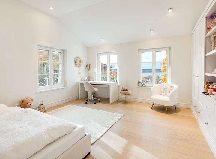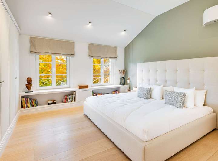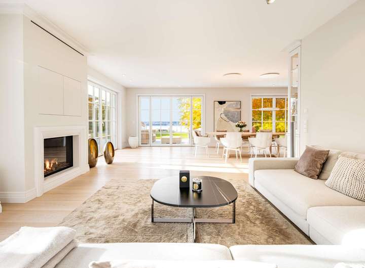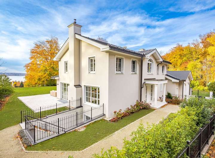 Dieses hochklassige Familiendomizil begeistert durch seine erhabene Lage oberhalb des Ammersees, durch fantastische Panoramablicke auf den See, eine exquisite Ästhetik und die äußerst detailreiche, stilvolle Ausstattung. Die Inspiration für die Architektur lieferten klassische Gründerzeitvillen – diesen unvergänglichen Stil reflektiert die Fassade mit einem Säulenportal, einem Mittelgiebel samt charmantem Rundbogenfenster und von dekorativen Putzfaschen gerahmten Sprossenfenstern.