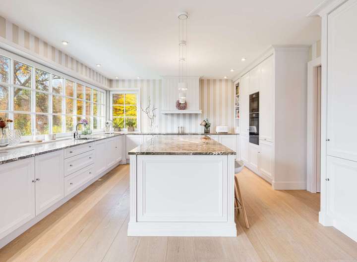 - Hochwertige Schreiner-Einbauküche (Schreinerei Dreer/Graf, Dießen) nach individueller Planung, mit Arbeitsinsel und Esstheke, Arbeitsplatten aus Breccia Paradiso vom Gardasee sowie mattweißen kassettierten Fronten mit Muschelgriffen, ausgestattet mit breitem Kochfeld samt Muldenlüfter, Backofen, Dampfgarer, Wärmeschublade, Geschirrspüler, Kühl-Gefrier-Kombination (alles Miele), Abfall-Trennsystem mit Sensor-Auszug und zahlreichen beleuchteten Vitrinen