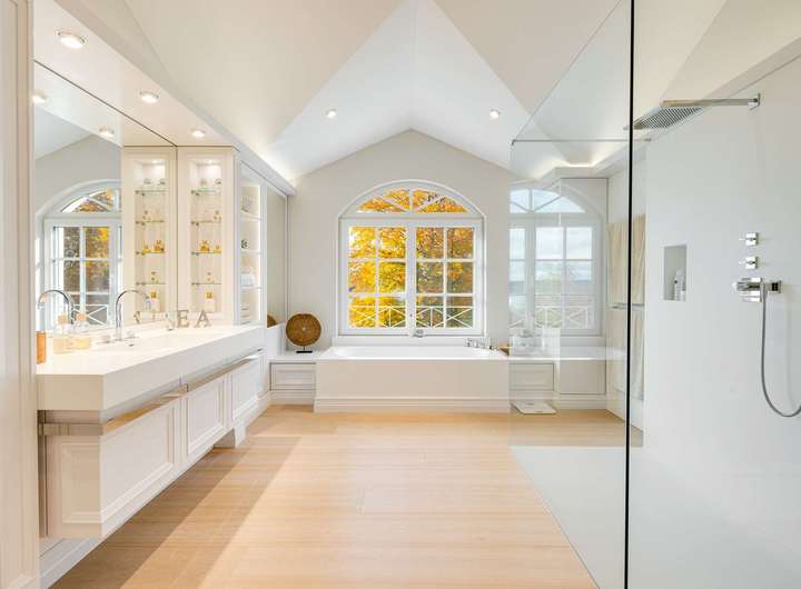 - Lichterfülltes Masterbad, gestaltet mit Eichen-Dielenparkett, kompletter Schreinerausbau mit LG HiMacs: Wanne, bodengleiche Walk-in-Dusche einschl. Rainshower, Shampoonische und Glasabtrennung, breitem Waschtisch einschl. Unterschrank und Dornbracht-Armaturen, flächenbündigem Spiegel, WC und Bidet (beides Villeroy & Boch), Wäscheabwurf sowie Deckenspots