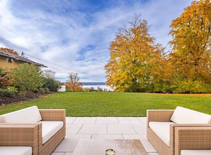 Ein Highlight ist der weitläufige Garten, der Platz für einen Pool bietet. Herrliche Blicke auf den Ammersee bereichern das Wohnen in diesem Traumdomizil Tag für Tag.