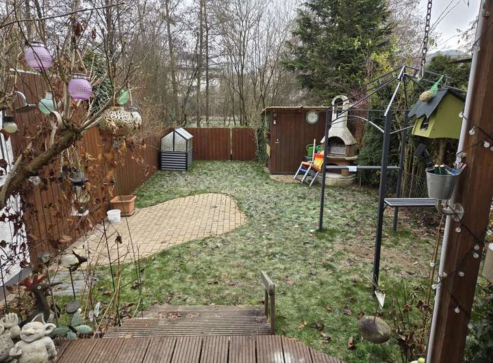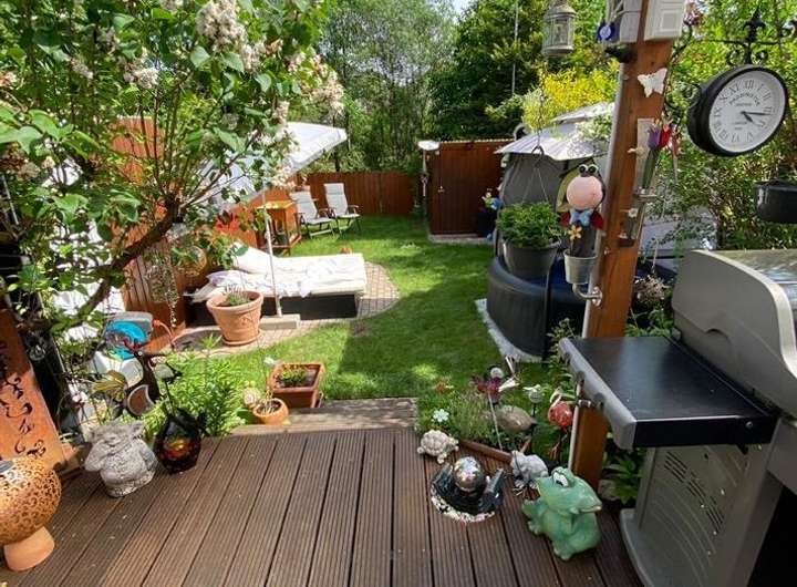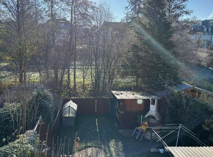 Der Garten mit einem Gartenhaus grenzt direkt an einem Grünstreifen.