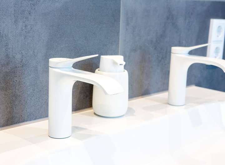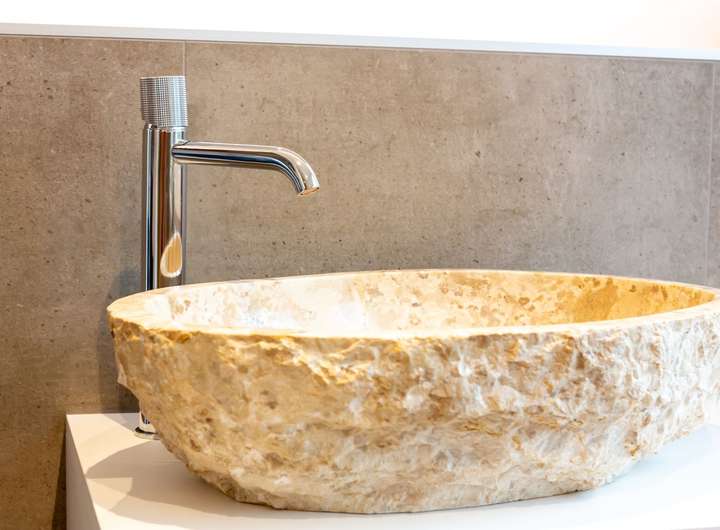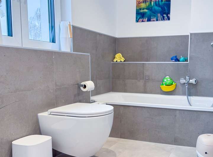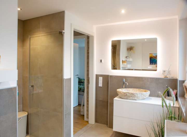 •Maßgefertigte Schreinerarbeiten bei den Waschbecken im Gäste-WC und im Badezimmer, zwei Badewannen und eine Regendusche