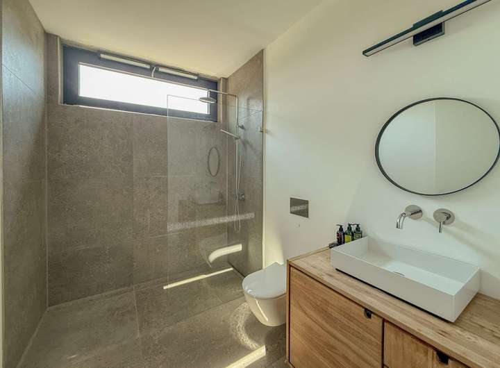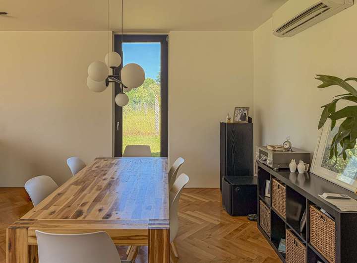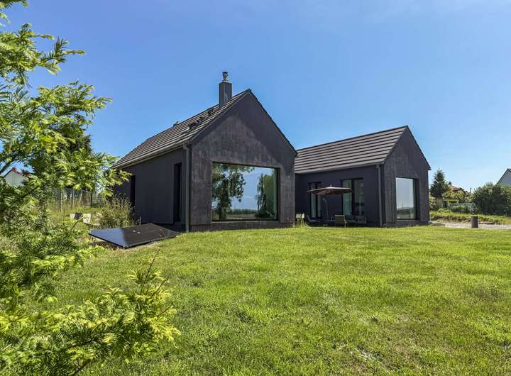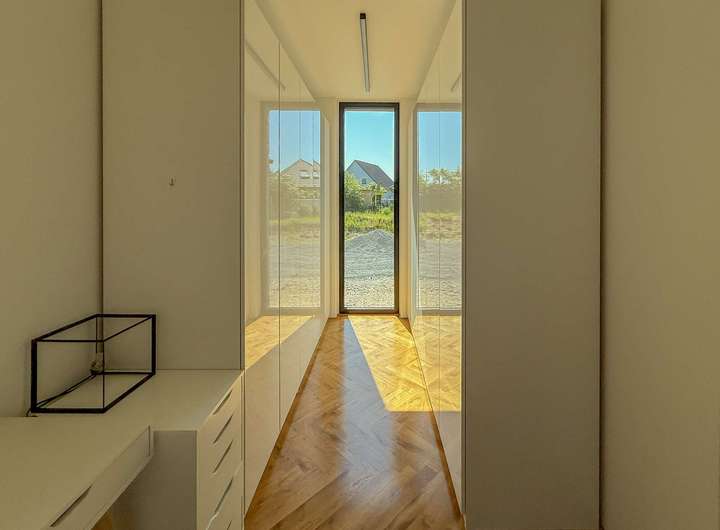 Dieses architektonisch besondere Einfamilienhaus wurde im Jahr 2020 in massiver Bauweise unter Verwendung hochwertiger Betonfertigteile errichtet. Es erstreckt sich vollständig über eine Ebene – nur der Dachboden ist über eine Treppe erreichbar.