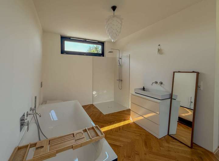 Für ein durchgehend angenehmes Raumklima sorgen die Fußbodenheizung im gesamten Haus sowie eine zentrale Klimaanlage im Wohnbereich. Stilvoll ergänzt wird das moderne Ambiente durch ein edles Fischgrätparkett, das sich harmonisch durch alle Räume zieht.
