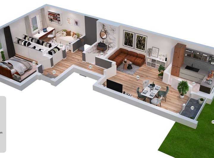 Nach Betreten der Wohnung erwartet Sie ein großzügiger Eingangsbereich. Von hier aus gelangen Sie in ein Schlafzimmer, ein Kinderzimmer, ein Gäste-WC sowie in den offenen und hellen Wohn- und Essbereich mit integrierter Küche. Die angrenzende Terrasse mit Garten in sonniger Süd-West Ausrichtung lädt zum Entspannen und Verweilen ein.